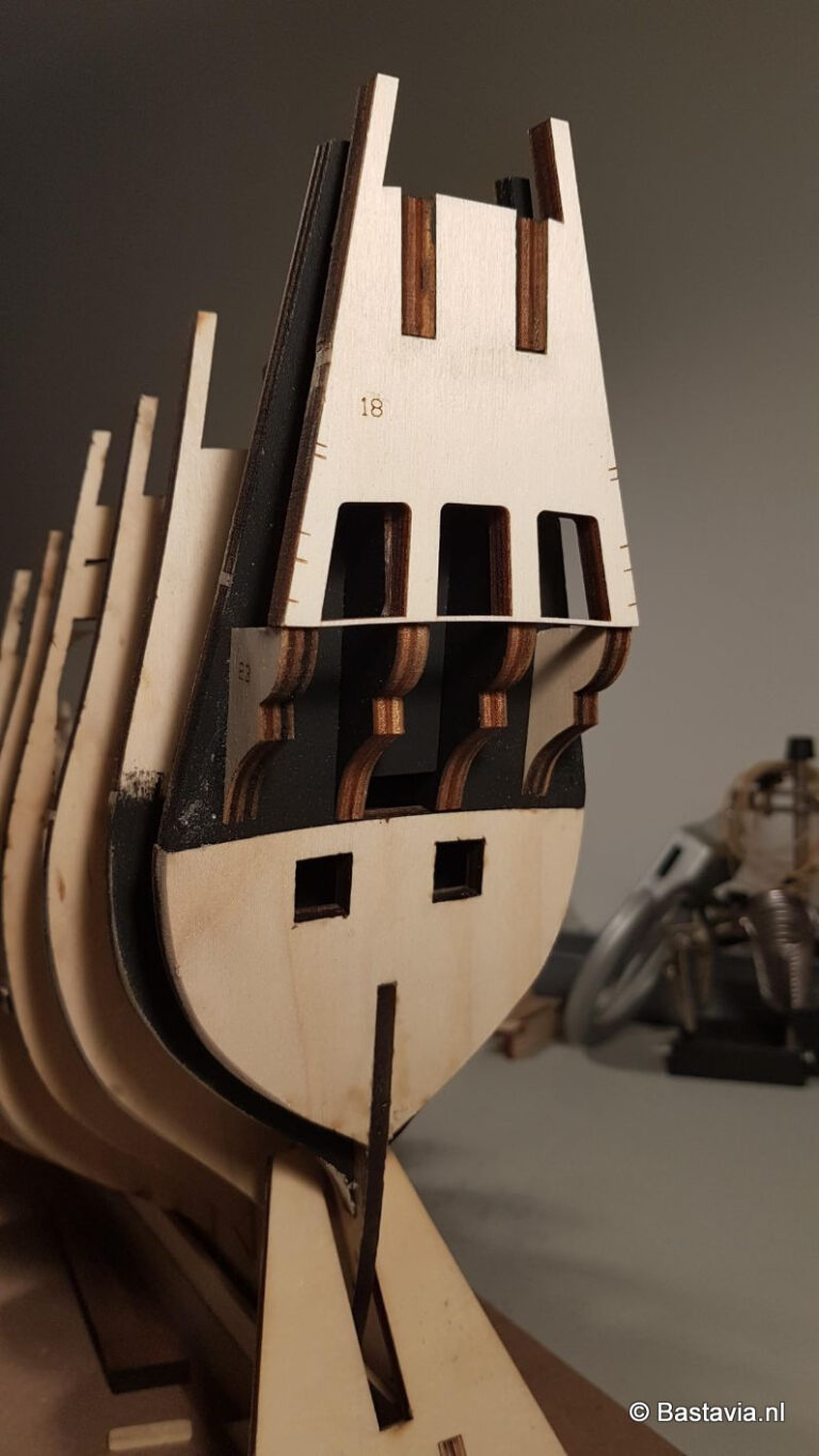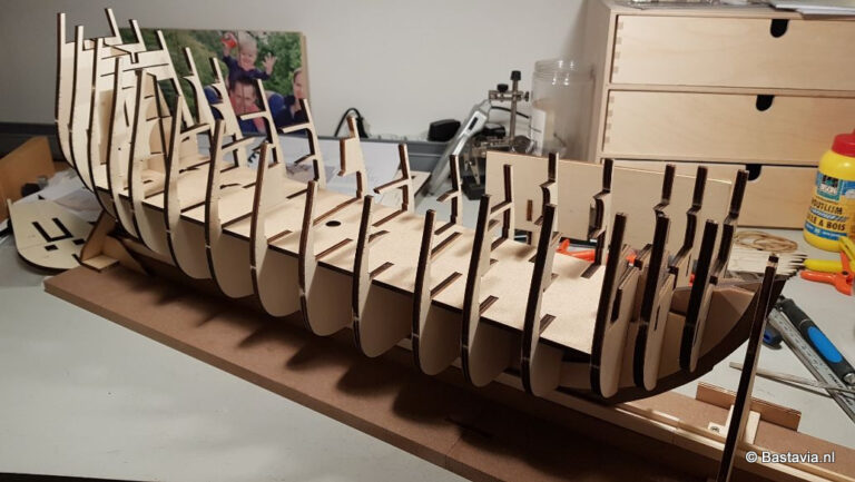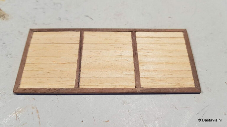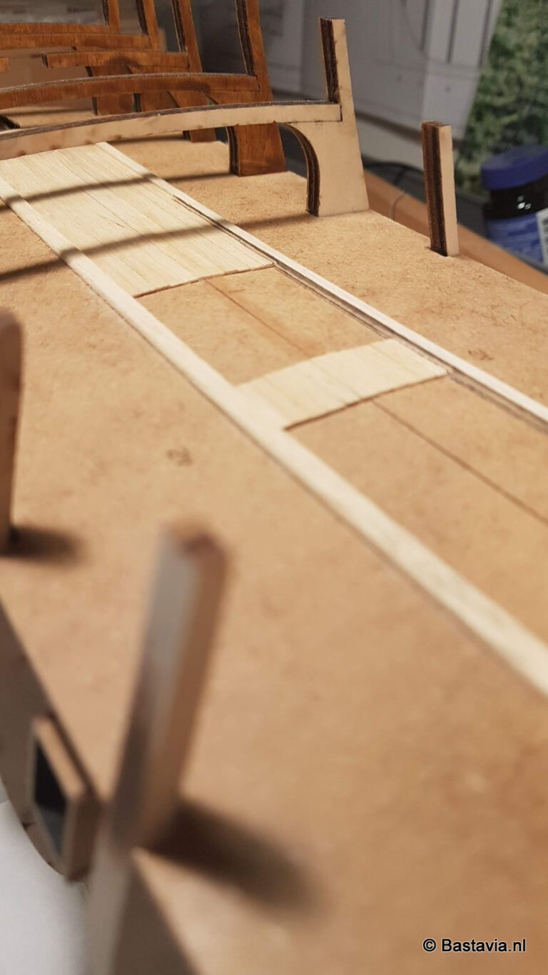 De beplanking tussen de schaarstokken is nu gereed en de gaten voor de masten zijn uitgeboord Ik ben begonnen met het beplanken van het verdek naast de schaarstokken richting de verschansing (zijwanden) van het schip en tevens (voor de afwisseling)…