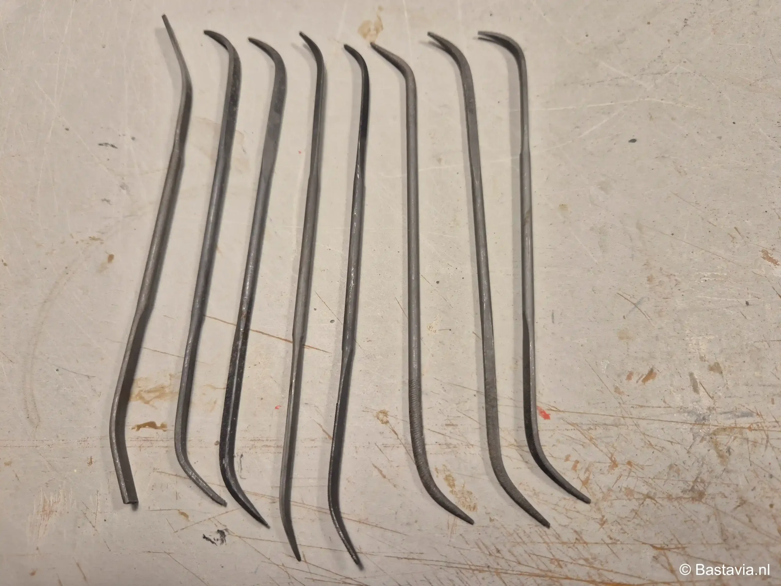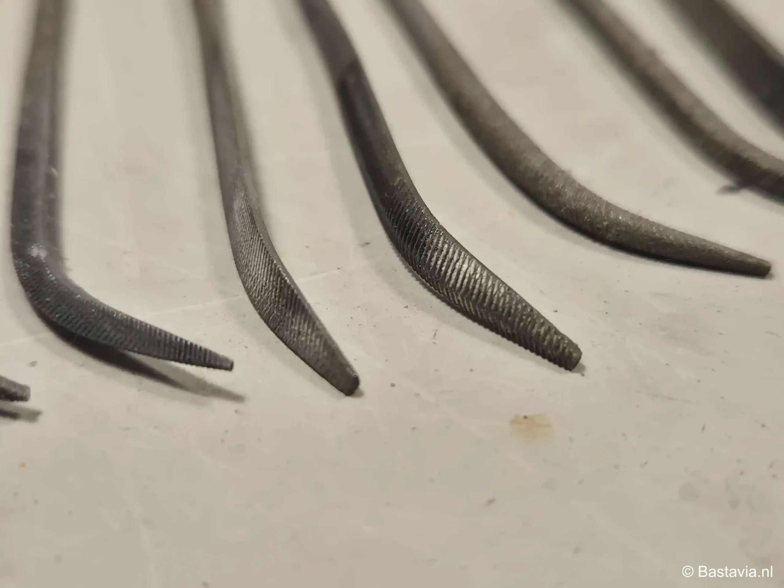 Bij het vijlen maak ik bijna altijd gebruik van gebogen vijltjes. Het voordeel van de gebogen vijltjes is dat je ook op het model zelf nog wat kan vijlen in moeilijk bereikbare hoekjes of onder een lastige hoek. Ik heb een hele set, dus verschillende vijltjes qua vorm en hoek. Zo heb je voor elk vijlklusje wel een geschikte tool. Daarnaast heb ik nog een vijlenset met rechte vijltjes, maar sinds ik de gekromde vijlen heb, gebruik ik deze nog maar weinig.